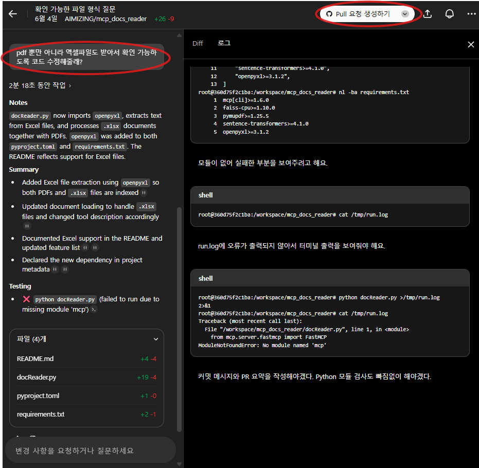 Codex의 Pull 요청 기능은 단순한 코드 수정을 넘어, 실제 협업 단계까지 자연스럽게 연결되도록 도와주는 중요한 기능입니다. 별도의 명령어나 수동 작업 없이, 버튼 클릭만으로 PR을 생성하고 깃허브에 반영할 수 있어 매우 효율적입니다.