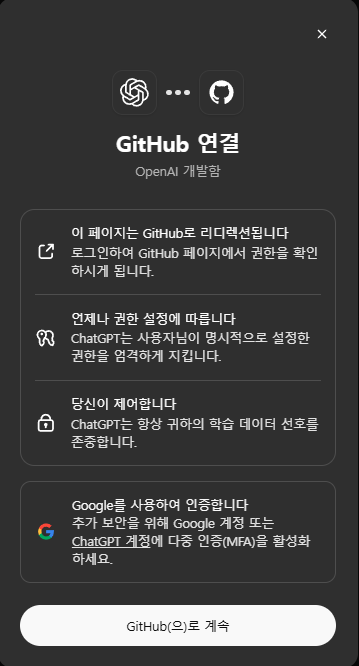 "Codex 온보딩 페이지"에서 시작하기 버튼을 클릭하면 깃허브 계정을 연결하기 위한 화면이 나타납니다(아래 첫 번째 이미지). "GitHub으로 계속" 버튼을 클릭하면 깃허브 로그인 페이지로 이동하며, ChatGPT는 사용자가 명시적으로 허용한 범위 내에서만 접근합니다.