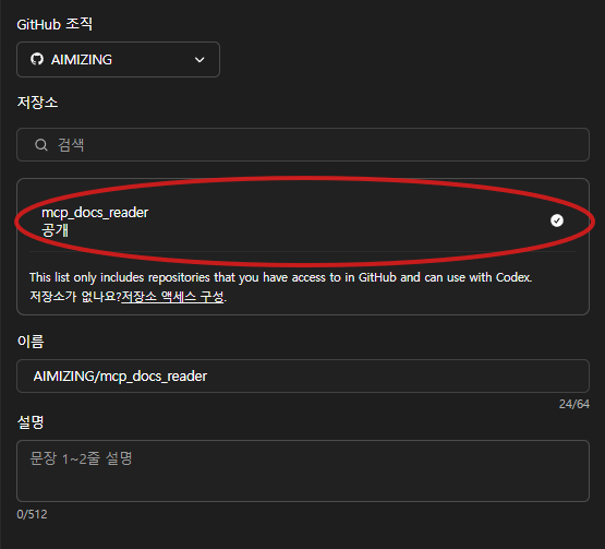 연동이 완료되면 연결할 저장소를 선택한 뒤(아래 이미지), Codex 작업의 이름과 간단한 설명을 입력하고 "환경 만들기" 버튼을 클릭하여 Codex 실행 환경을 생성합니다.