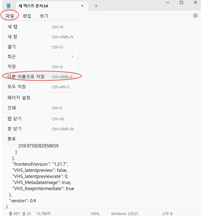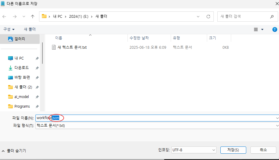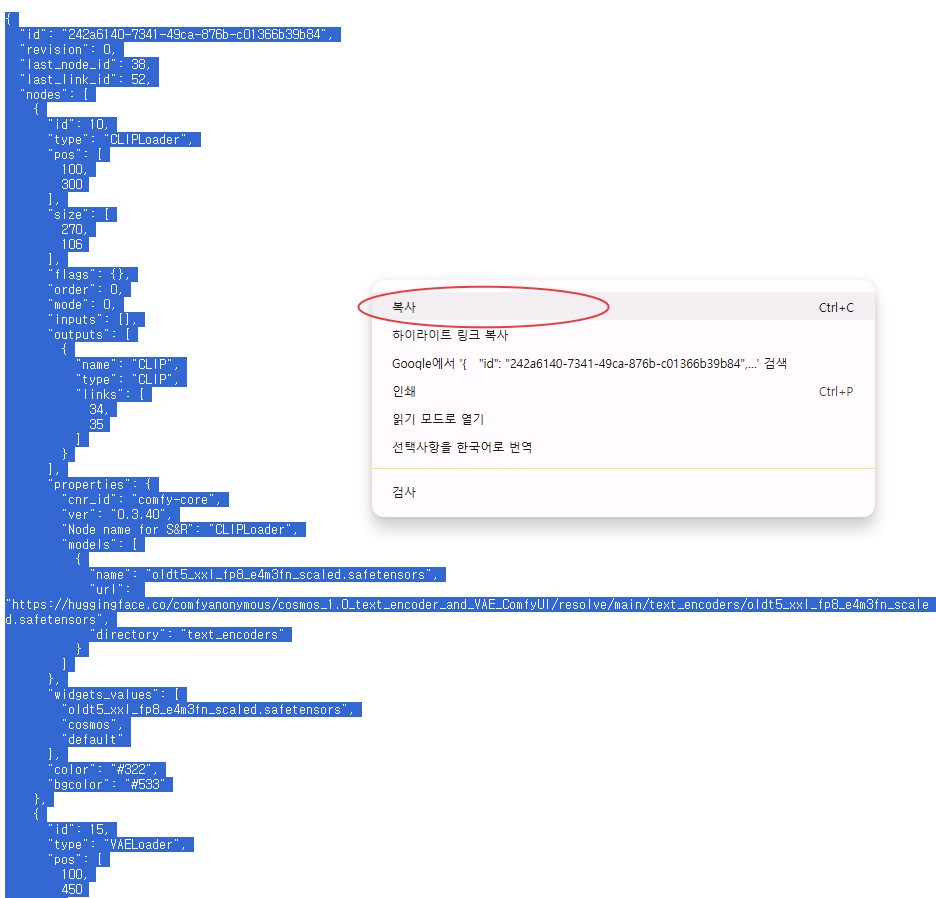 해당 워크플로우는 JSON 형식의 텍스트 파일로 제공되며, 이를 메모장 등 텍스트 편집기에 복사해 붙여넣은 뒤 파일 확장자를 .json으로 저장하시면 됩니다. 저장한 .json 파일을 ComfyUI 실행 화면으로 드래그 앤 드롭하면 워크플로우가 자동으로 불러와집니다.