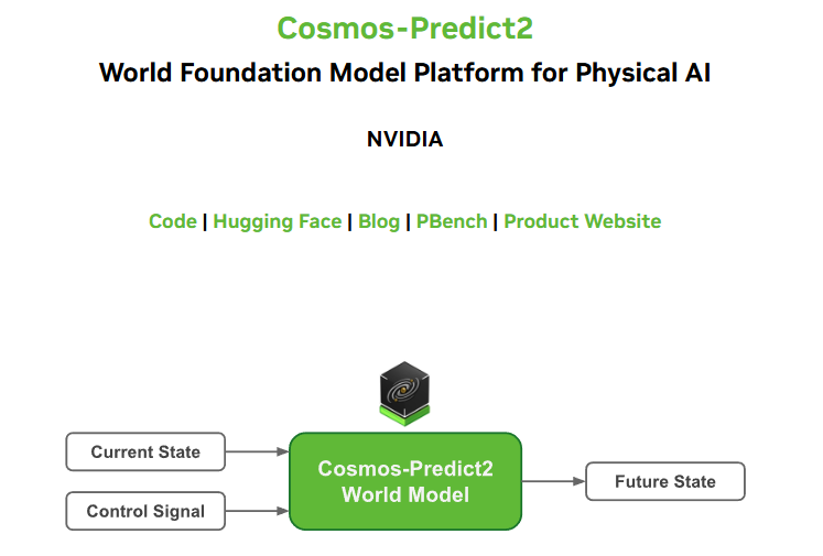 Cosmos-Predict2는 NVIDIA가 개발한 차세대 월드 파운데이션 모델(World Foundation Model, WFM)로, 물리 기반 AI(Physical AI)를 포함해 자율주행, 로보틱스, 산업 자동화 등 다양한 분야에서 실제 세계의 동적 상태와 상호작용을 예측하고 생성하는 데 최적화된 모델입니다.