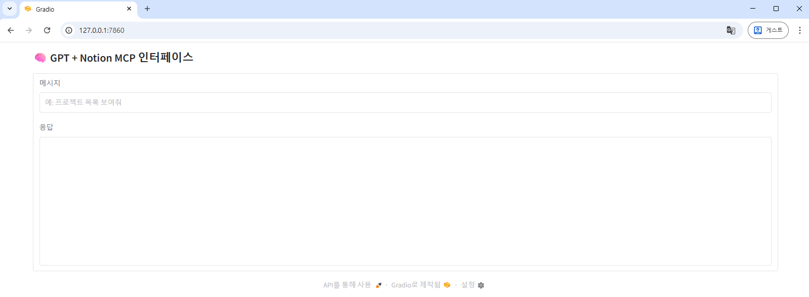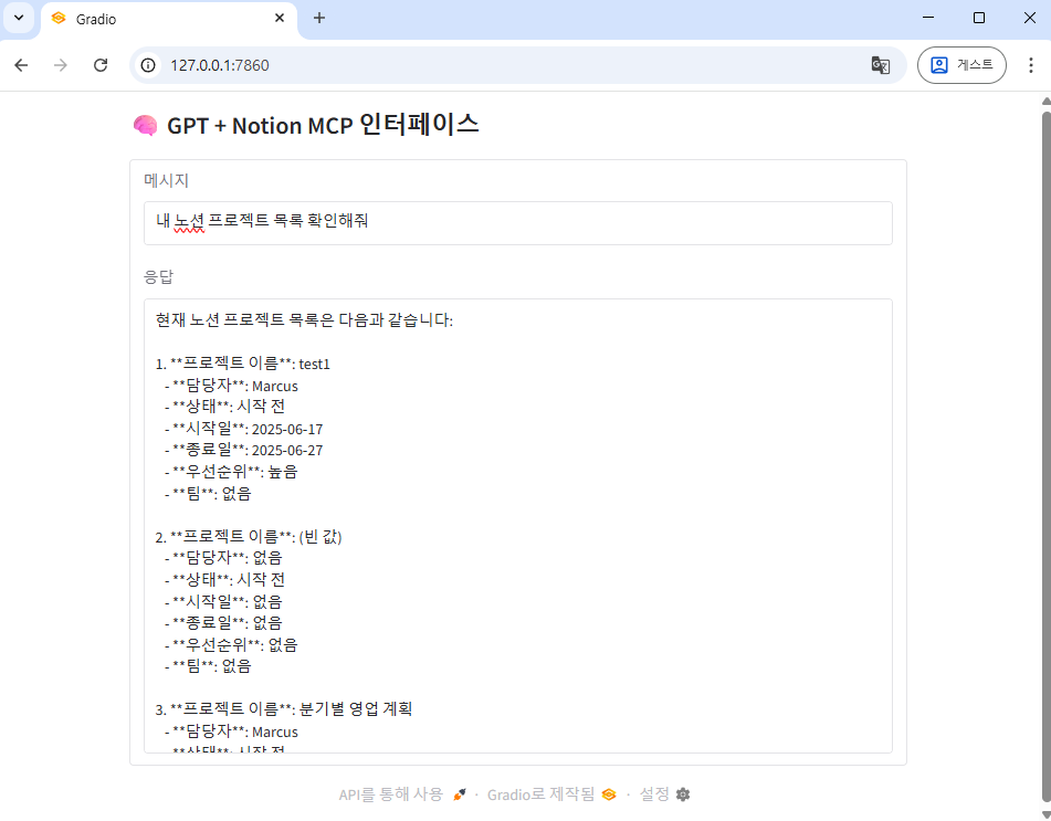 이제 모든 준비가 완료되었습니다. 아래 명령어를 실행하여 MCP 서버를 먼저 구동하고, 이후 Gradio 인터페이스를 통해 GPT에게 Notion 프로젝트 분석을 요청할 수 있습니다.