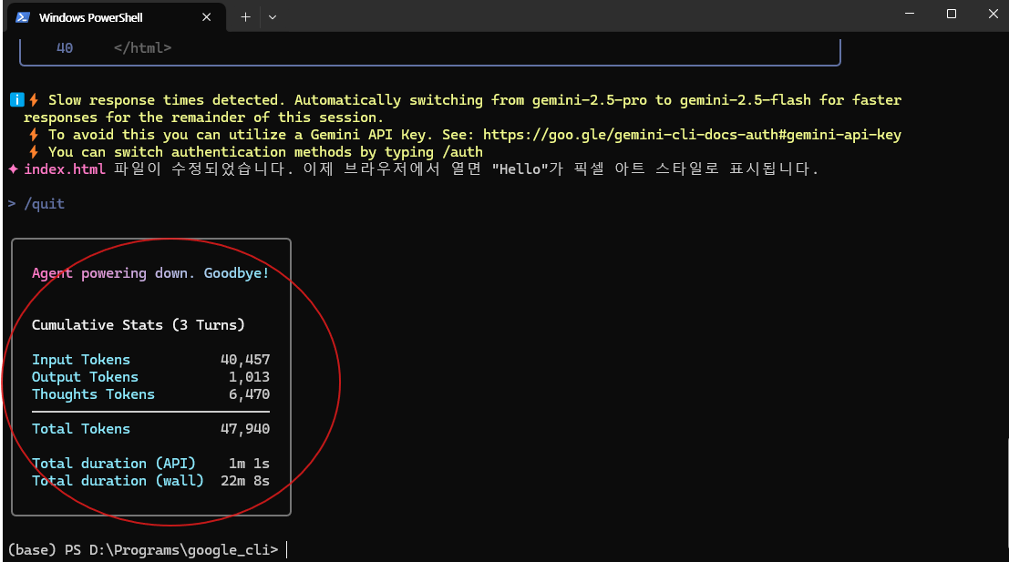 Gemini CLI를 종료하면, 지금까지 사용한 요청 횟수, 토큰 수, 소요 시간 등의 요약 정보를 확인할 수 있습니다.