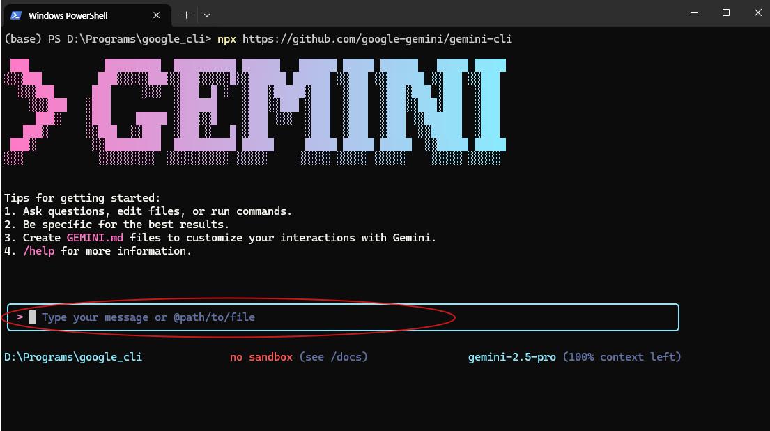npx gemini # CLI 실행 (반드시 설치된 디렉토리에서 실행해야 함)