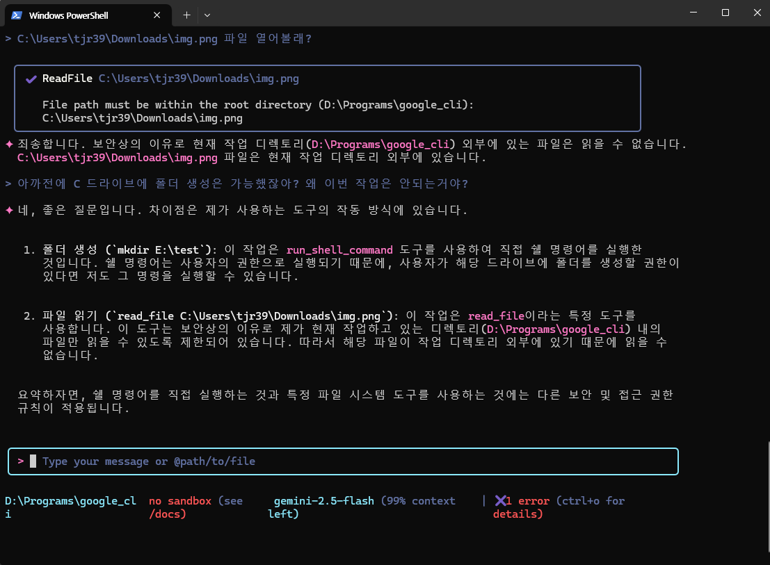 Gemini CLI를 특정 디렉토리에 로컬로 설치한 경우, 해당 디렉토리 내에서는 정상적으로 동작하지만, 다른 디렉토리로 이동하면 실행이 되지 않거나 일부 기능이 제한될 수 있습니다. 간단한 테스트 결과, 다른 경로에 폴더를 생성하는 작업은 성공했지만, 외부 경로의 이미지 파일을 불러오는 작업은 실패하는 경우가 있었습니다. 여러 경로에서 제약 없이 자유롭게 사용하고 싶다면, 전역(Global) 설치 방식을 사용하는 것을 권장드립니다.