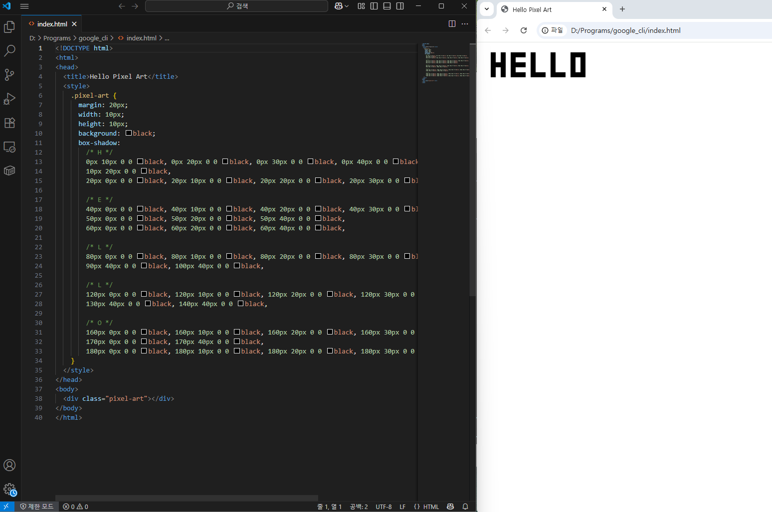 또한, 파일 수정 요청도 가능합니다. 예를 들어, "Hello"라는 문장이 포함된 HTML 파일을 픽셀아트처럼 보이도록 수정해달라는 프롬프트를 입력하면, Gemini CLI는 해당 요청을 분석하고 작업을 준비합니다. 이때 Gemini CLI의 중요한 특징이 나타납니다. 바로, AI가 사용자의 파일을 곧바로 수정하지 않고 반드시 사전 승인을 요청한다는 점입니다. AI는 수행할 작업의 내용을 요약해 보여주고, “이렇게 수정해도 괜찮을까요?” 라고 사용자에게 확인을 구합니다. 사용자가 승인하면 그제서야 실제 파일 수정 작업이 실행됩니다. 아래는 이 과정과 수정 결과를 캡처한 이미지입니다.