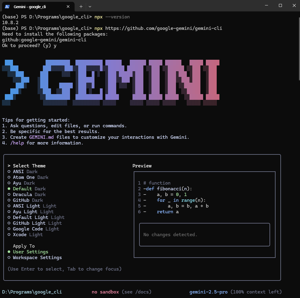 실행이 성공하면 Gemini CLI의 첫 화면이 나타납니다. 처음에는 테마를 선택하는 화면이 나타나며, 이후에도 언제든지 변경할 수 있습니다. 테마를 선택하면 이어서 인증 방식 선택 단계로 넘어갑니다.