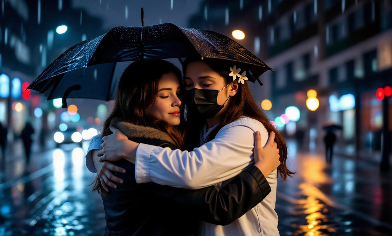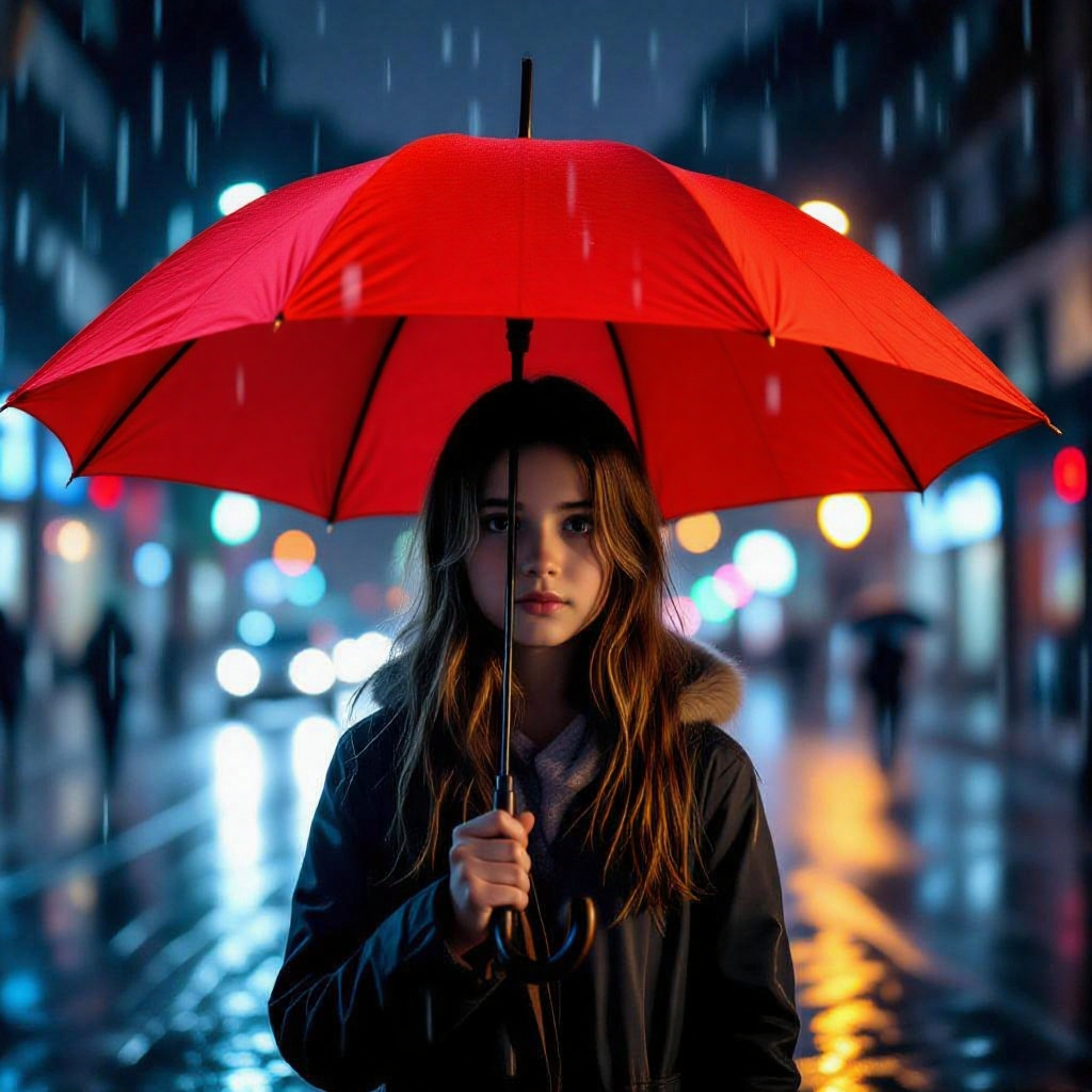 - Create a cinematic, moody portrait of a young girl standing in the rain at night. Change the umbrella to a vibrant red one, Keep her **facial features, hairstyle, and expression** unchanged. Preserve the **natural lighting, soft depth of field, and consistent color tones**.