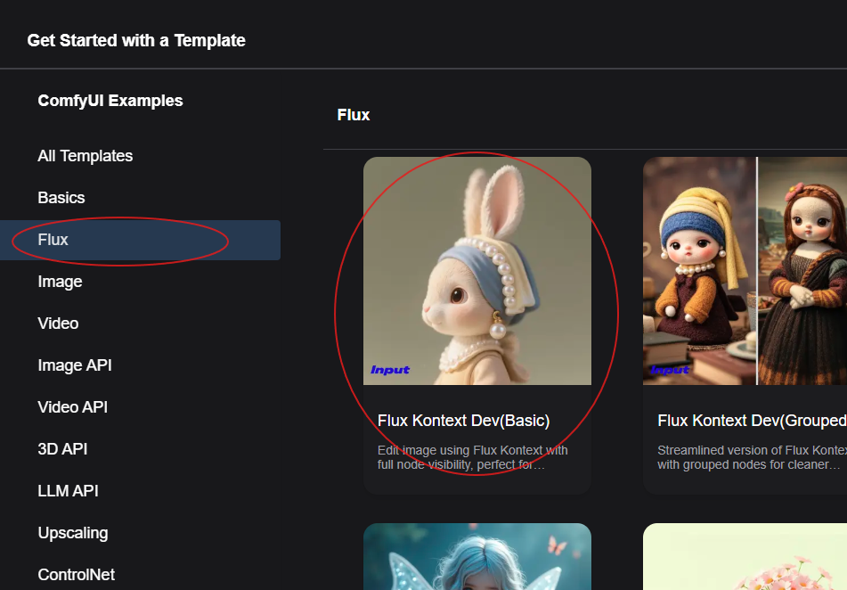 - 왼쪽 템플릿 탭에서 Flux를 선택한 뒤, "Flux Kontext Dev (Basic)" 워크플로우를 실행합니다.