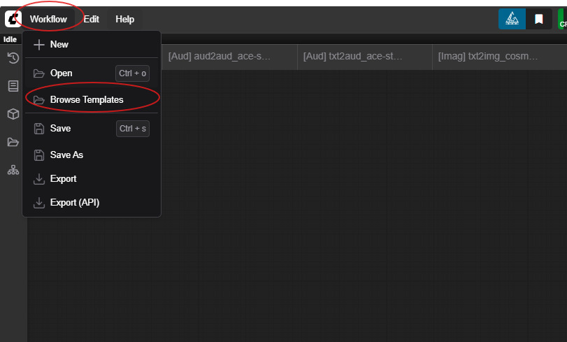 - 왼쪽 상단 메뉴에서 "Workflow" → "Browse Templates"로 이동합니다.
