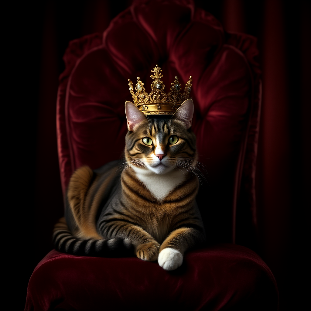 - 긍정 프롬프트 : A cat with a crown lounging on a velvet throne, royal atmosphere, luxurious fabric texture, regal pose, detailed fur, ornate crown, dramatic lighting