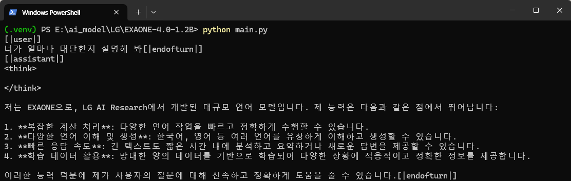 아래 명령어를 통해 main.py 파일을 실행하면, EXAONE-4.0-1.2B 모델이 로드되어 텍스트 생성 작업을 수행하게 됩니다.