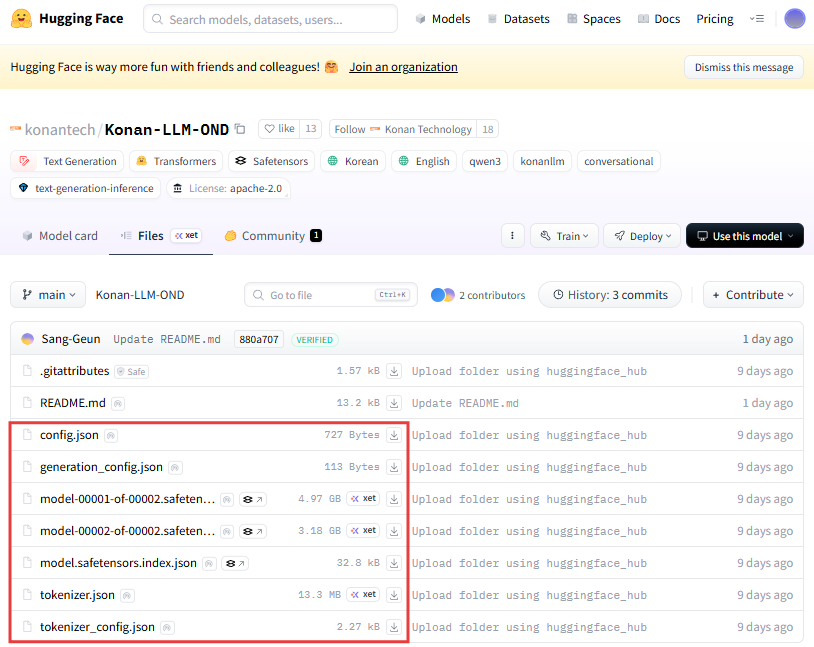 아래 코난테크놀로지 허깅페이스에서 Konan-LLM-OND 모델을 다운로드하실 수 있습니다. 아래 이미지에 표시된 파일을 모두 다운로드하여 동일한 디렉토리에 저장합니다.
