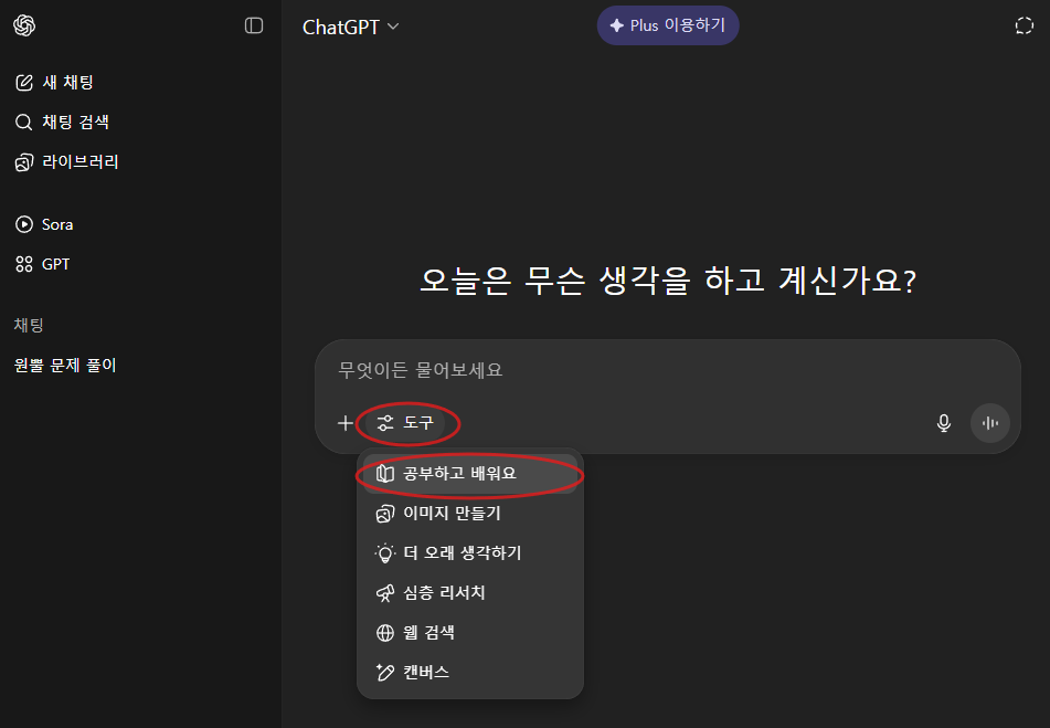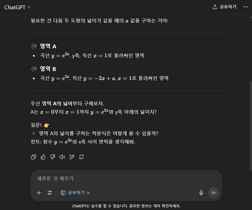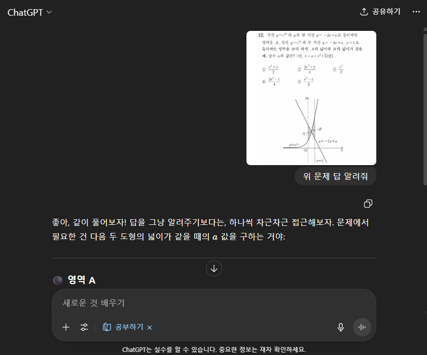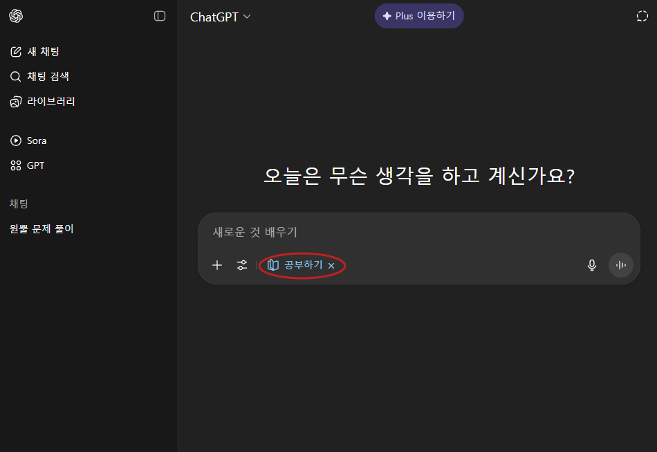 우선 ChatGPT에서 '공부하기' 모드를 활성화한 뒤, 해당 문제를 입력하고 풀이를 요청합니다. 이때 일반 대화 모드와는 달리, ChatGPT는 정답을 바로 알려주는 대신, 문제를 단계별로 함께 분석하고 힌트와 유도 질문을 통해 사고 과정을 유도합니다.