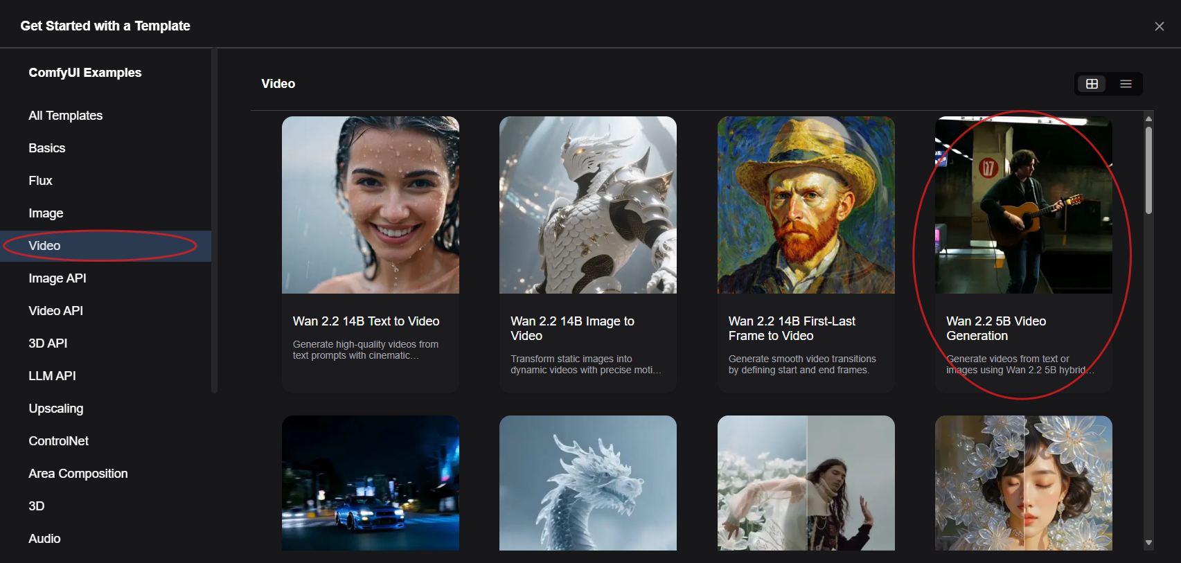- "Video" 항목에서 "Wan 2.2 5B Video Generation"을 클릭