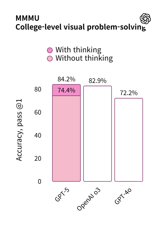 GPT-5는 Thinking 모드를 활성화했을 때 84.2%의 정답률을 기록하며, OpenAI o3(82.9%), GPT-4o(72.2%)를 앞질렀습니다.