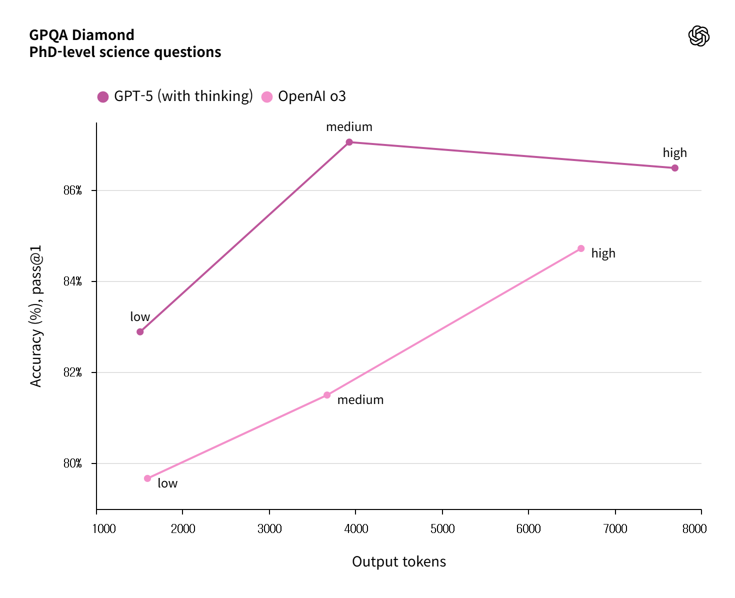 GPQA Diamond 벤치마크에서도 GPT-5는 모든 출력 토큰 구간에서 OpenAI o3를 능가했습니다. 특히 Medium 출력 길이 구간에서 약 86% 이상의 정확도를 달성하며, 긴 문맥 속에서도 일관된 정답률을 유지하는 뛰어난 추론 능력을 보였습니다.