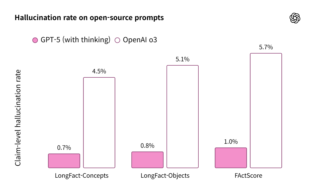 - LongFact-Concepts: GPT-5 0.7% (o3 대비 약 6.4배 감소)