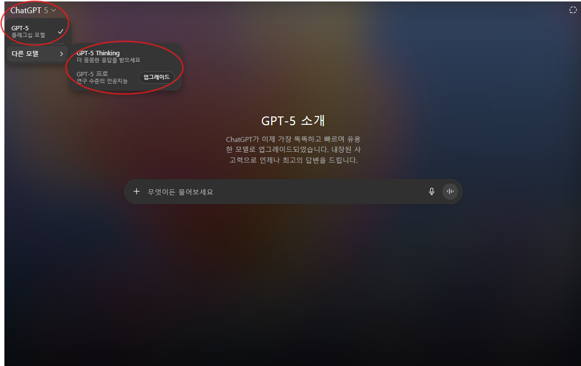 현재 ChatGPT 웹 서비스에 접속하면 GPT-5 모델만 사용 가능하도록 구성되어 있습니다. 이전 세대 모델인 GPT-4o, GPT-4.5, o4-mini 등은 모두 비활성화되어 일반 사용자 메뉴에서 선택할 수 없습니다.