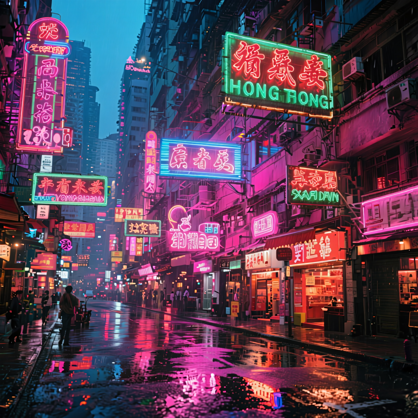 - 사용 프롬프트 : A vibrant, warm neon-lit street scene in Hong Kong at the afternoon, with a mix of colorful Chinese and English signs glowing brightly. The atmosphere is lively, cinematic, and rain-washed with reflections on the pavement. The colors are vivid, full of pink, blue, red, and green hues. Crowded buildings with overlapping neon signs. 1980s Hong Kong style.
