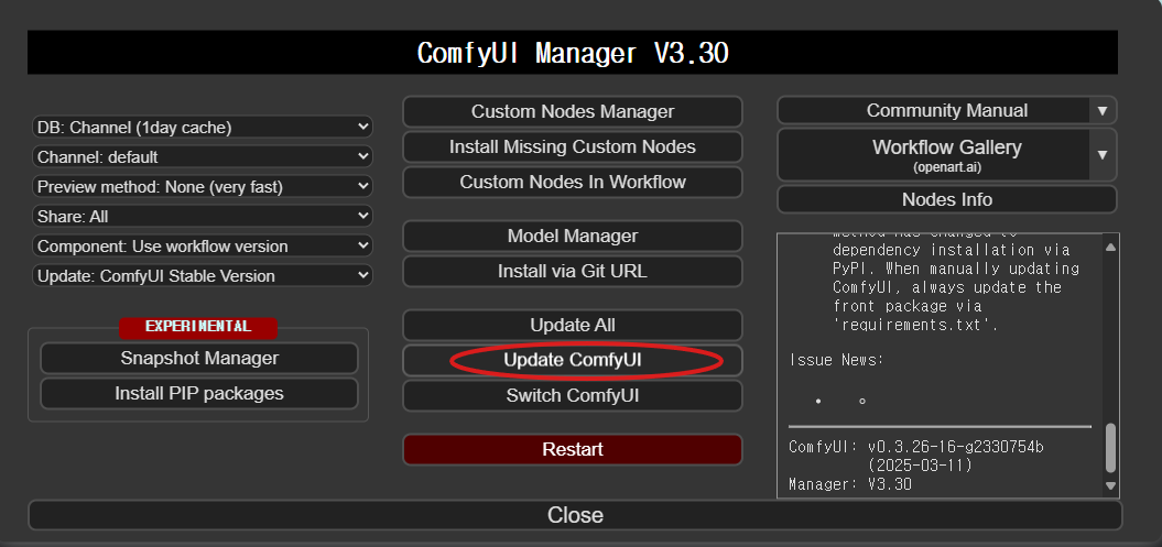 - ComfyUI를 로컬에 설치한 경우 → ComfyUI-Manager에서 "Update ComfyUI" 버튼을 눌러 최신 버전으로 업데이트하세요.