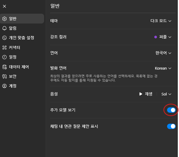 현재 사용자는 모델 선택 메뉴에서 ‘레거시 모델’을 선택하면 이전 세대 모델을 활용할 수 있습니다. 만약 해당 옵션이 보이지 않는 경우, 화면 좌측 하단의 사용자 계정 버튼 → 설정 → 추가 모델 보기를 활성화하면 표시됩니다.