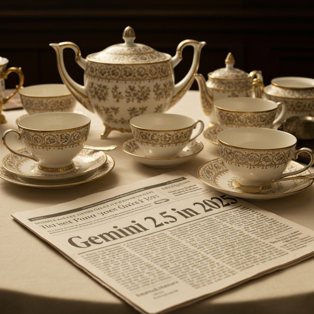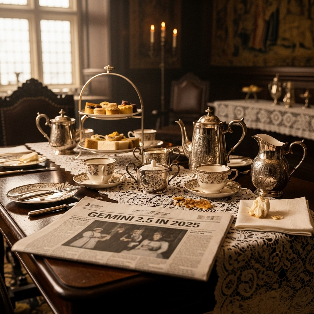 - 사용 프롬프트 : An evocative image of an English afternoon tea table in a period drama setting, specifically reminiscent of the Queen Elizabeth I era. The table is adorned with a newspaper, prominently displaying the headline 'Gemini 2.5 in 2025'. Ensure the scene is rich in historical detail and atmosphere, but devoid of any human presence. Focus on the intricate details of the tea set, the newspaper's texture, and the ambient lighting typical of that period.