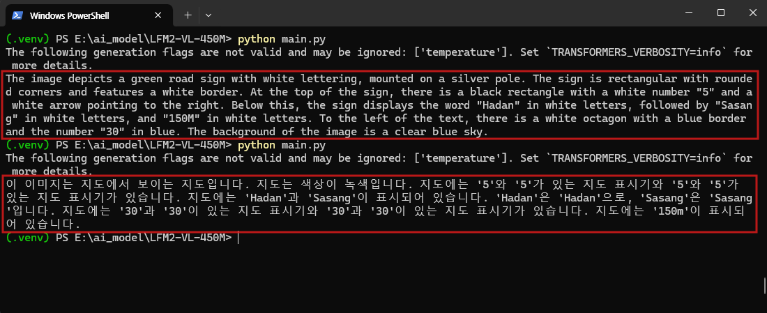 현재 LFM2-VL 모델은 한국어 출력을 지원하긴 하지만, 아직 정확도 면에서는 다소 아쉬운 부분이 있습니다. 세 번째 테스트 이미지(도로 표지판)를 입력했을 때, 영어 프롬프트에서는 표지판의 색상, 모양, 글자, 숫자까지 세부적으로 비교적 정확히 설명했지만, 한국어 프롬프트에서는 반복적인 표현과 불필요한 중복이 나타났습니다. 업로드한 예시 이미지를 통해 동일한 표지판에 대한 영어와 한국어 출력 결과를 직접 비교할 수 있으며, 이를 통해 모델이 한국어를 일부 지원하고 있음을 확인할 수 있습니다. 다만 실제 활용을 위해서는 후처리나 추가적인 개선 작업이 필요할 것으로 보입니다.