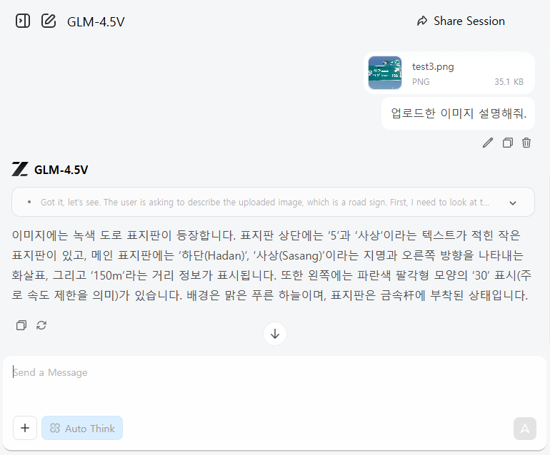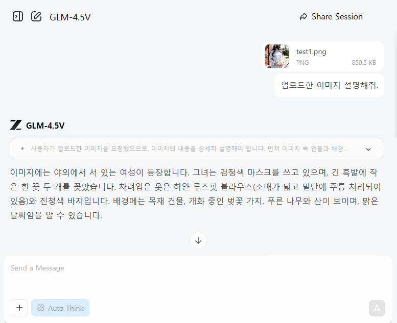 간단한 이미지를 업로드한 뒤 “이미지를 설명해 달라”는 요청을 한글로 입력하면, GLM-4.5V는 한국어로 오류 없이 자연스러운 답변을 제공합니다. 업로드한 이미지를 세밀하게 분석해 장면 속 인물, 사물, 배경 요소까지 구체적으로 설명하며, 한국어 표현 또한 매끄럽게 처리합니다.