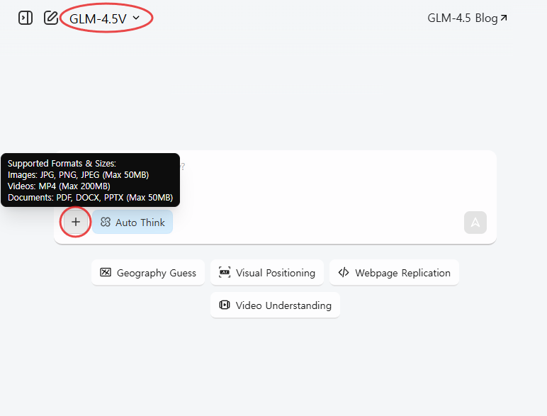 Z.ai 플랫폼에 접속하면 화면 왼쪽 상단에서 원하는 모델을 직접 선택할 수 있습니다. 이 중 GLM-4.5V를 선택하면, 프롬프트 입력창에서 단순히 텍스트만 입력하는 것이 아니라 이미지 파일을 업로드하여 분석 요청을 할 수 있는 기능이 활성화됩니다. 또한 이미지뿐만 아니라 영상 파일까지 입력할 수 있어, 장면 이해나 이벤트 인식 등 다양한 멀티모달 작업을 실험할 수 있습니다.