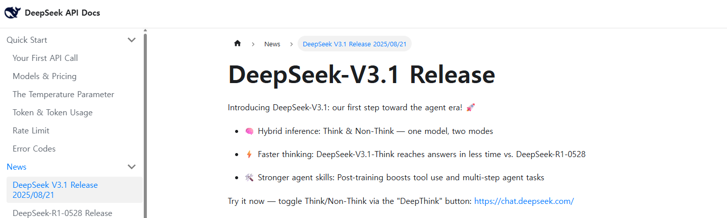 - DeepSeek 공식 API 페이지 : https://api-docs.deepseek.com/news/news250821