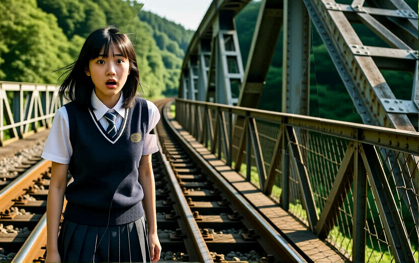 - 사용 프롬프트 : A realistic cinematic portrait of a teenage girl standing on a railway bridge, front view, same pose as original image, shocked expression, natural sunlight, detailed facial features, realistic skin texture, casual school uniform with vest and tie, natural black hair with realistic strands, metal railing and railway tracks in sharp detail, depth of field, photorealistic, cinematic movie still frame, 8k ultra quality, dramatic lighting, Fujifilm film look, highly detailed background with lush green forest, following the depth map.