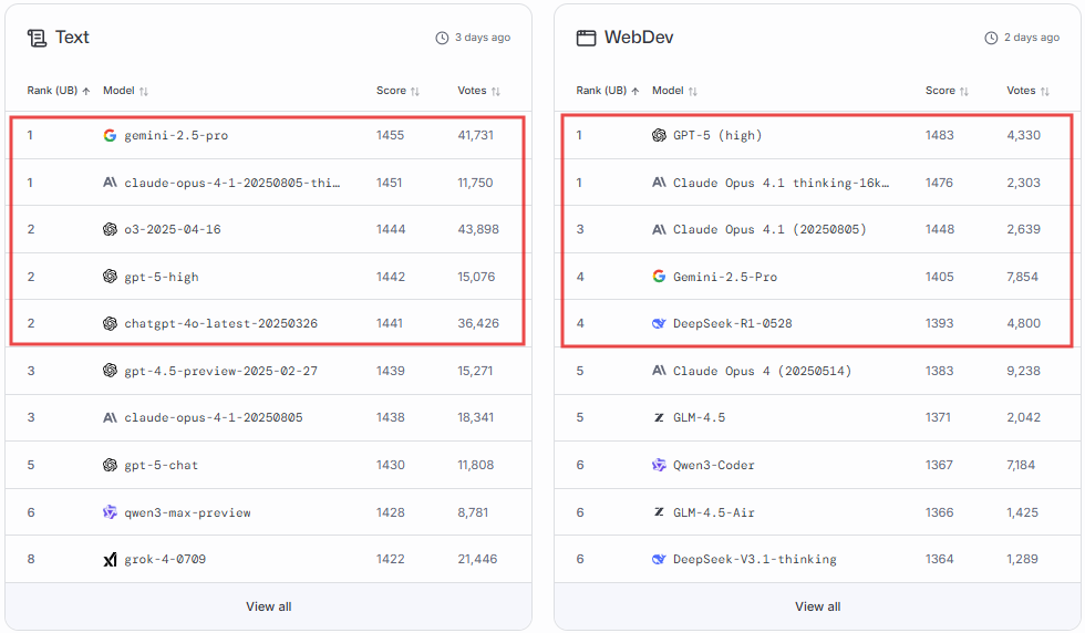 AI 모델 성능을 실사용자 투표 기반으로 비교하는 플랫폼 LMArena의 2025년 9월 최신 순위를 바탕으로, Text(일반 대화)와 WebDev(웹 개발) 두 가지 주요 카테고리에서 어떤 모델들이 두각을 나타내고 있는지 비교해 보겠습니다.