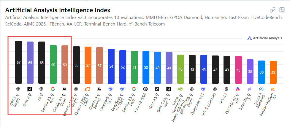 - 종합 벤치마크 점수 (Artificial Analysis) : https://artificialanalysis.ai/