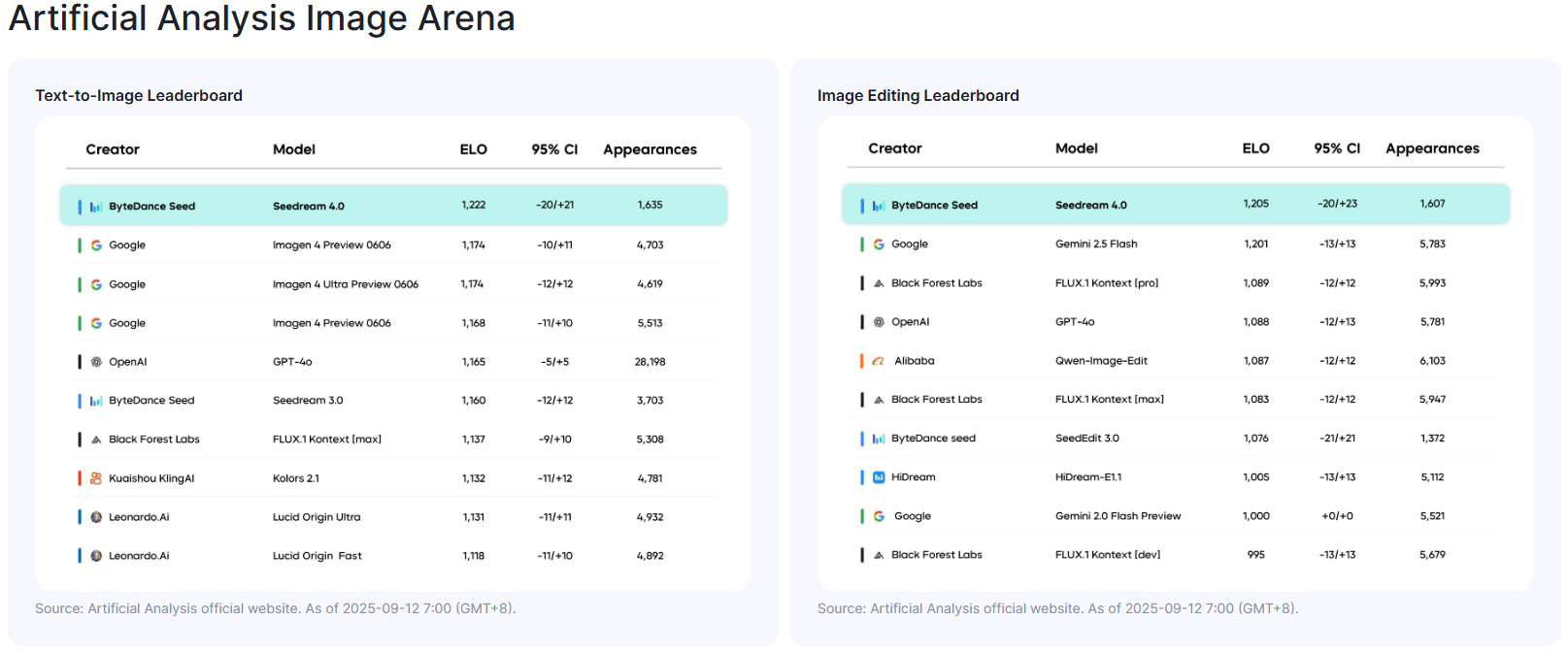 Seedream 4.0은 2025년 9월12일 기준, Artificial Analysis Image Arena 벤치마크에서 텍스트-투-이미지(Text-to-Image)와 이미지 편집(Image Editing) 두 부문 모두 1위를 기록했습니다.