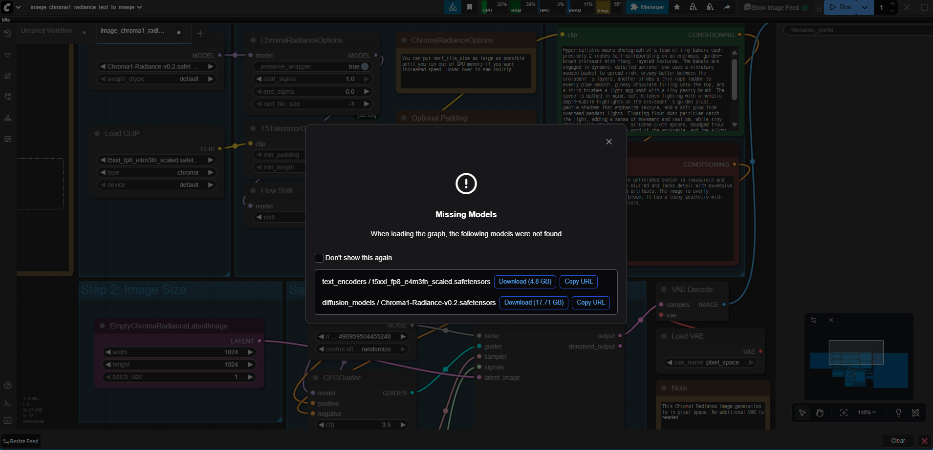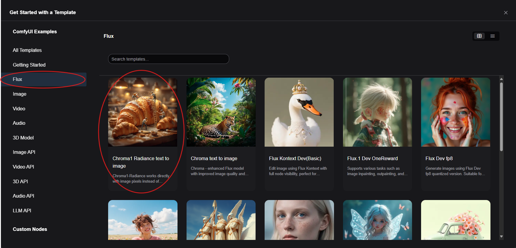 - "Flux" 항목에서 "Chroma1 Radiance text to image" 버튼 클릭