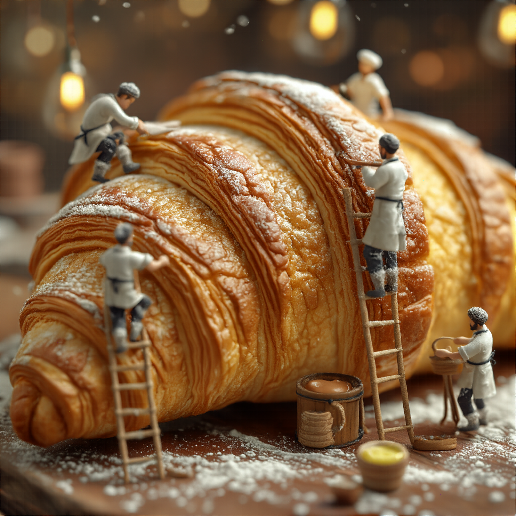 Hyperrealistic macro photograph of a team of tiny bakers—each precisely 2 inches tall—collaborating on an enormous, golden-brown croissant with flaky, layered textures. The bakers are engaged in dynamic, detailed actions: one uses a miniature wooden bucket to spread rich, creamy butter between the croissant’s layers, another climbs a thin rope ladder to evenly pipe smooth, glossy chocolate filling onto the top, and a third brushes a light egg wash with a tiny pastry brush. The scene is bathed in warm, soft kitchen lighting with cinematic depth—subtle highlights on the croissant’s golden crust, gentle shadows that emphasize texture, and a soft glow from overhead pendant lights. Floating flour dust particles catch the light, adding a sense of movement and realism, while tiny details like the bakers’ stitched cloth aprons, smudged flour on their faces, the rough wood of the worktable, and the slight sheen of melted butter on the croissant are rendered with ultra-precision. Ultra-detailed, 8K resolution, photorealistic textures, sharp focus on the bakers and croissant, shallow depth of field to blur the background slightly, rich warm color palette, lifelike proportions, and a cozy, whimsical atmosphere that balances realism with charm.