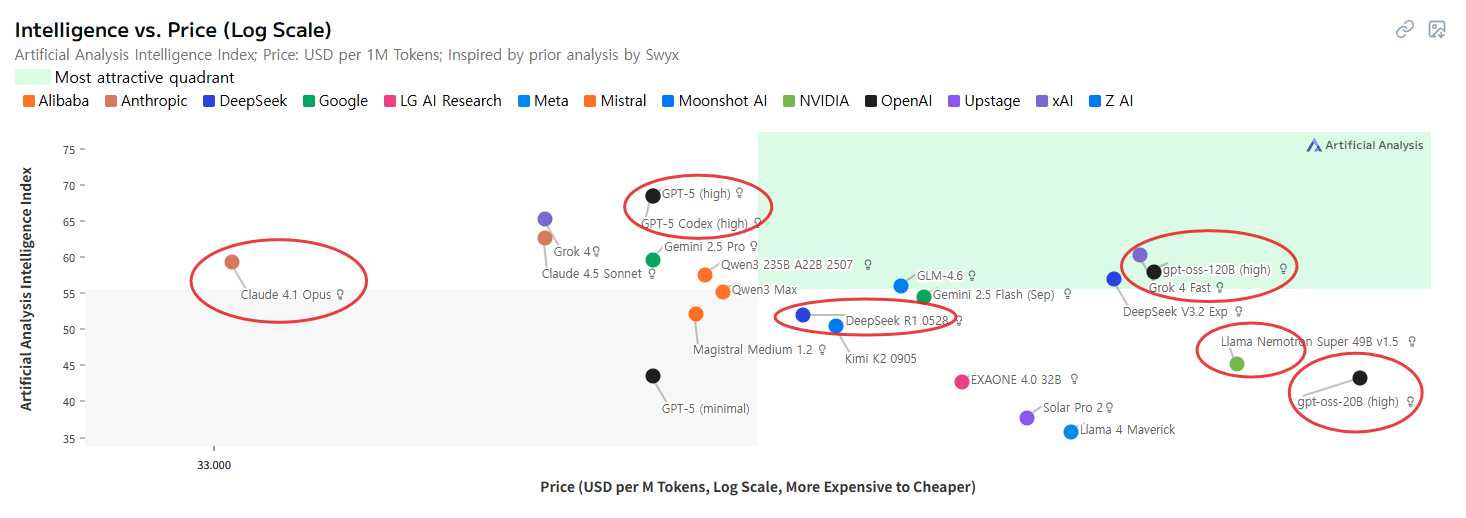 AI 모델의 경쟁력을 평가할 때는 단순한 성능뿐 아니라 비용 대비 효율성도 함께 살펴볼 필요가 있습니다. 이번 비교에서는 Artificial Analysis의 ‘Intelligence vs. Price’ 지표를 참고하여, 지능 지수와 토큰 단가를 함께 고려했을 때 효율성이 높은 모델들을 정리했습니다. 기준점은 가장 지능점수가 높은 GPT-5 (high) 모델로 설정했습니다.