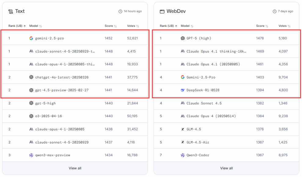 이제 각 지표별로 구체적인 결과를 살펴보겠습니다. 먼저 LMArena의 2025년 10월 최신 순위를 기준으로, 실제 사용자 평가에서 높은 선호도를 보인 모델들을 비교합니다. 특히 Text(일반 대화)와 WebDev(웹 개발) 두 가지 주요 카테고리를 중심으로, 어떤 모델이 실사용자 경험에서 두각을 나타내고 있는지 비교해 보겠습니다.