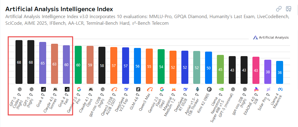 2025년 10월 기준, GPT-5 (high)와 GPT-5 Codex (high)가 공동 1위를 차지하며 현존 최고 수준의 지능 지수를 기록했습니다. Claude 4.5 Sonnet은 안정적인 언어 이해력과 추론 능력을 바탕으로 상위권을 유지하고 있으며, xAI의 Grok 4과 Grok 4 Fast 모델이 상위권을 유지하며 강력한 경쟁력을 보여주고 있습니다.