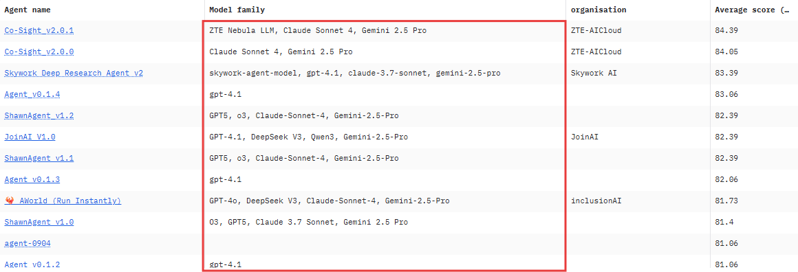 2025년 10월 GAIA 리더보드에서는 Claude Sonnet 4와 Gemini 2.5 Pro를 조합한 에이전트가 평균 84점대로 가장 높은 성능을 기록했습니다. 특히 ZTE-AICloud의 Co-Sight v2 시리즈가 1·2위를 차지했으며, Skywork Deep Research Agent v2가 83점대로 뒤를 이었습니다. 상위권에 오른 에이전트들은 공통적으로 Gemini와 Claude 계열 모델을 함께 사용하고 있어, 두 모델이 에이전트 환경에서 우수한 문제 해결 능력을 보인다는 점을 확인할 수 있습니다. 또한 GPT-4.1 기반 에이전트 역시 평균 82점대를 기록하며 안정적인 성능을 유지했습니다.