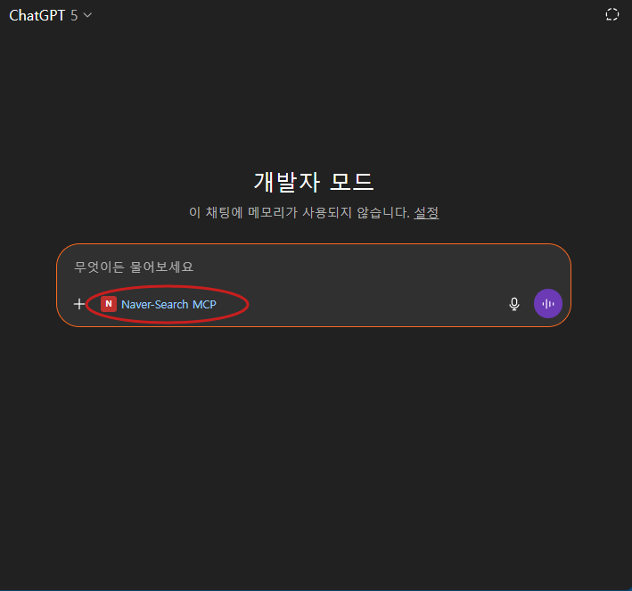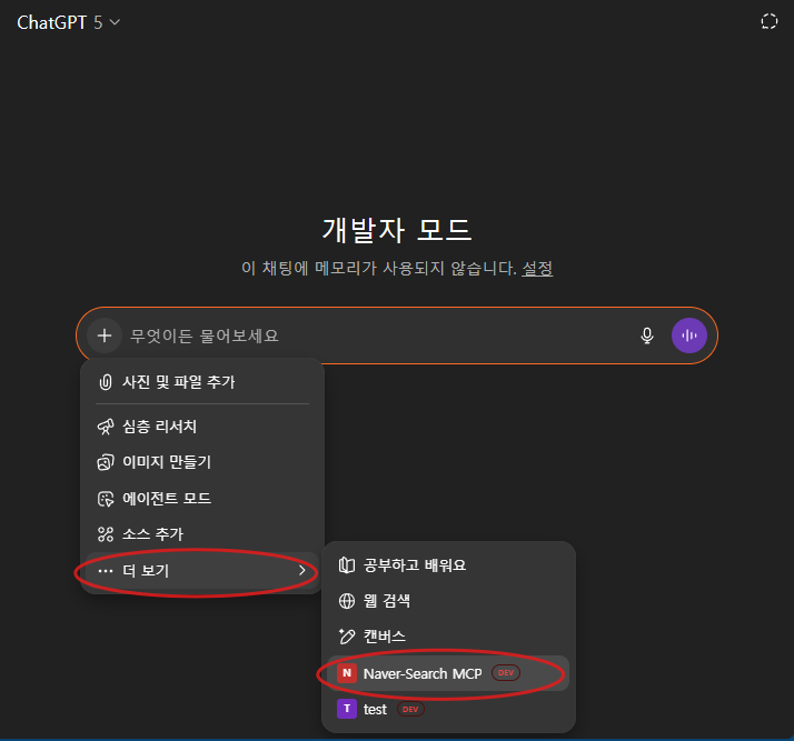 MCP 등록이 완료되었으니, 이제 ChatGPT가 MCP를 활용하여 실제로 답변을 생성하는지 확인해보겠습니다. 먼저 프롬프트 입력창에서 ‘더 보기’ 버튼을 클릭한 뒤, 등록된 MCP(Naver-Search MCP)를 선택하여 활성화합니다. 활성화가 완료되면 프롬프트 창 상단에 해당 MCP가 표시되며, 정상적으로 연결되었음을 확인할 수 있습니다.