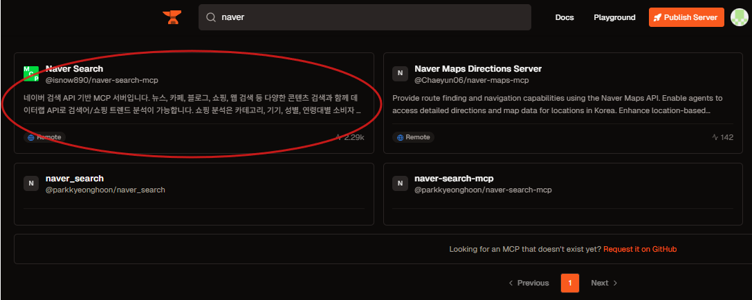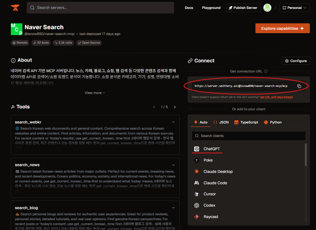 이 플랫폼에서는 여러 사용자가 만든 공개 MCP 서버를 손쉽게 탐색하고 사용할 수 있습니다. 그중에서 원하는 MCP를 선택해 바로 ChatGPT와 연동할 수 있습니다. 이번 글에서는 네이버 검색 API를 기반으로 한 MCP 서버를 예시로 사용하겠습니다.
