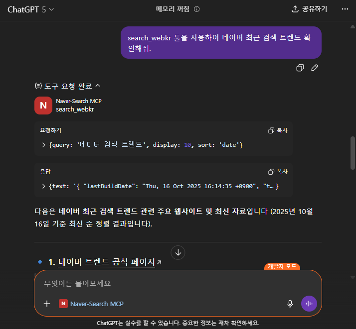 아래는 MCP를 호출하는 과정과 특정 툴을 지정하여 네이버 검색 결과를 기반으로 ChatGPT가 생성한 실제 응답 예시입니다.