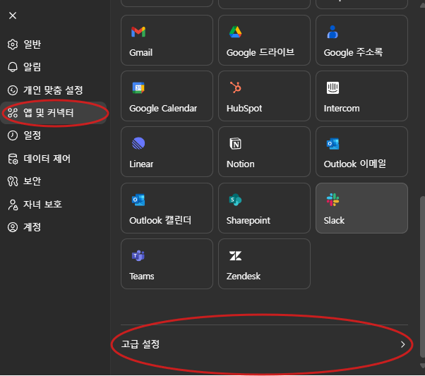 - ‘앱 및 커넥터(Apps & Connectors)’ 메뉴를 선택한 뒤, ‘고급 설정(Advanced Settings)’으로 들어갑니다.