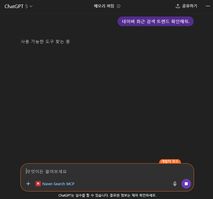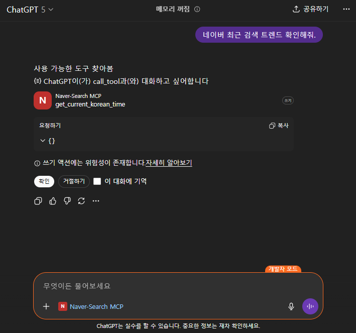 이제 프롬프트에 "네이버 최근 검색 트렌드 확인해줘."라는 문장을 입력해봅니다. 그러면 ChatGPT는 사용 가능한 MCP 도구를 자동으로 탐색하고, 도구 사용 전 사용자에게 한 번 더 확인을 요청합니다. 승인 후에는 MCP를 호출하여 사용자의 요청에 맞는 결과를 검색하고, 이를 바탕으로 실시간 정보를 반영한 답변을 생성합니다.