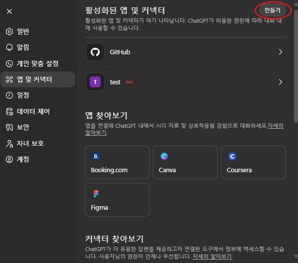 - ‘앱 및 커넥터(Apps & Connectors)’ 메뉴에서 활성화된 앱 및 커넥터에서 ‘만들기’를 선택합니다.