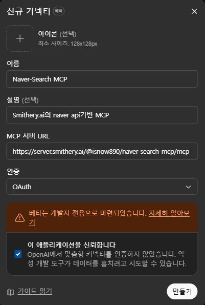 - Smithery.ai에서 확인한 "Connection URL"을 MCP 서버 URL 입력란에 입력한 후, ‘만들기(Create)’ 버튼을 클릭합니다.