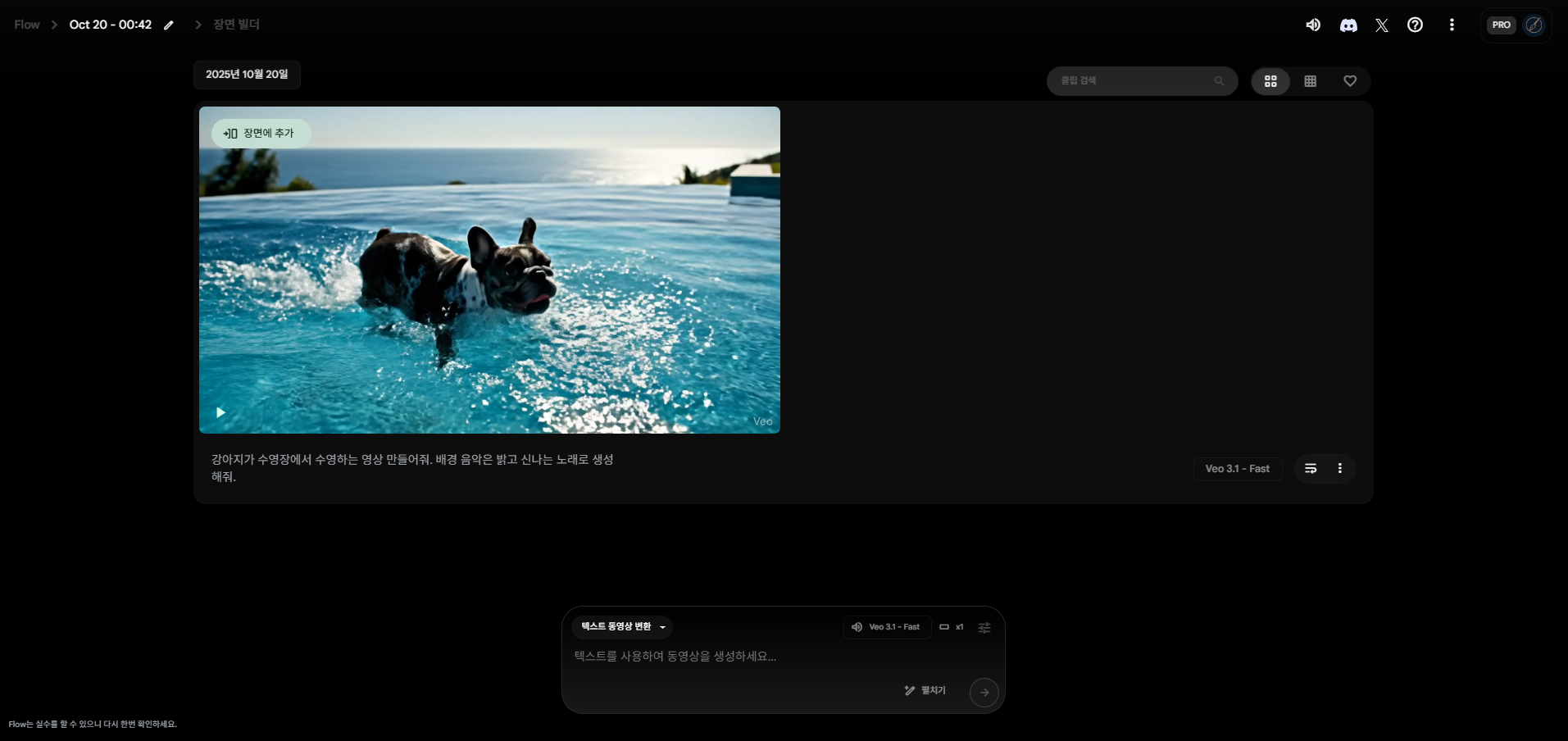 Flow는 구글이 영상 생성을 전문적으로 수행하기 위해 구축한 플랫폼으로, Gemini보다 세밀한 옵션 설정이 가능합니다. 한 번의 생성으로 약 8초 길이의 영상이 만들어지며, 오디오가 자동으로 포함된 형태로 출력됩니다. 전체 생성 과정은 약 1~2분 내외로 진행됩니다.