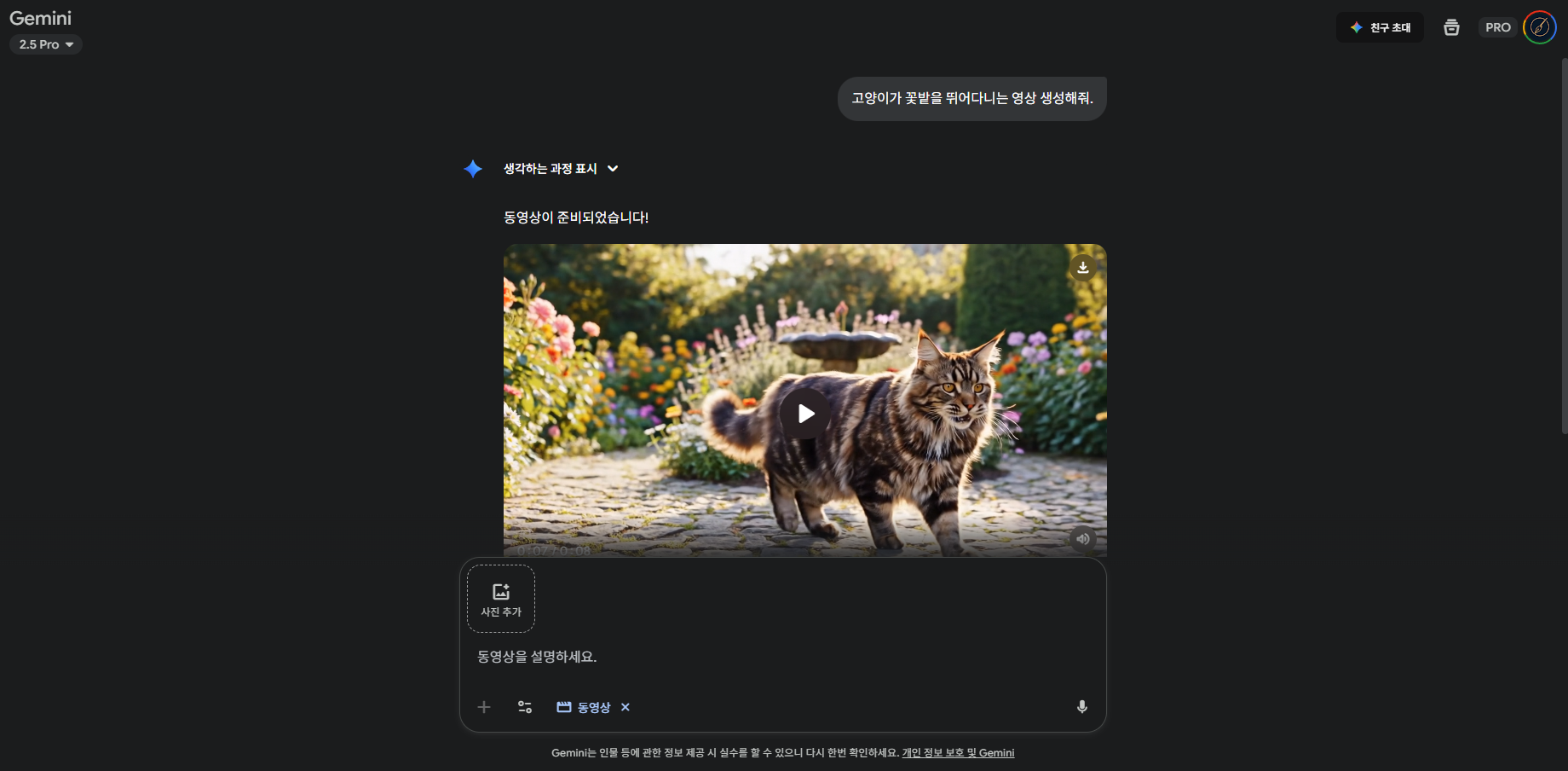 프롬프트 입력창에서 ‘도구’ → ‘Veo로 동영상 생성’을 선택한 후 원하는 문장을 입력하면 영상이 생성됩니다. 생성 결과는 약 8초 길이의 영상이며, 오디오가 자동으로 포함된 형태로 출력됩니다. 전체 생성 과정은 약 1~2분 정도 소요됩니다.